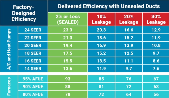 Source: Comfort Institute. Based on Department of Energy Research and FL Energy Office Research Report: FSEC-CR-397-91 Degradation above is typical. Impact is up to 50% greater on AC performance if return air leakage is from a hot attic or attached garage. Impact is typically 50% to 100% greater on winter heating performance of a heat pump with electric resistance auxiliary heat.